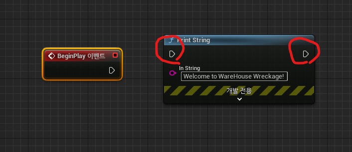 And there are Pins that are Sockets we can connect up. Left Pin called "Input Pin" which means when to run this node, Right Pin called "Output Pin" which means what to do after.