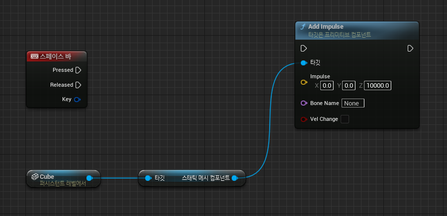먼저, 기존에 상자에 Impulse를 추가했었던 Connection을 제거합니다. 이때 Alt+클릭으로 핀을 누르면, 연결이 제거됩니다.