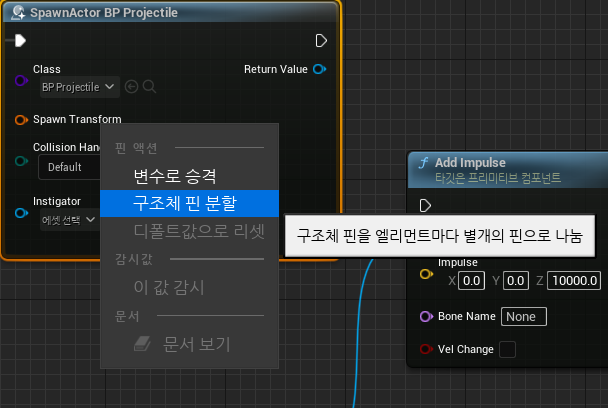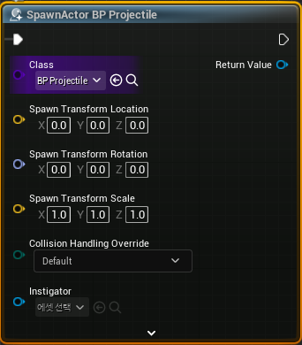 Spawn Actor node에는 Return Pin(Output of the Node)이 있는데, 이것은 노드를 실행시킨 결과로 반환되는 데이터나 오브젝트입니다. 따라서 현재는 BP_Projectile의 오브젝트 레퍼런스를 반환하고 있습니다.