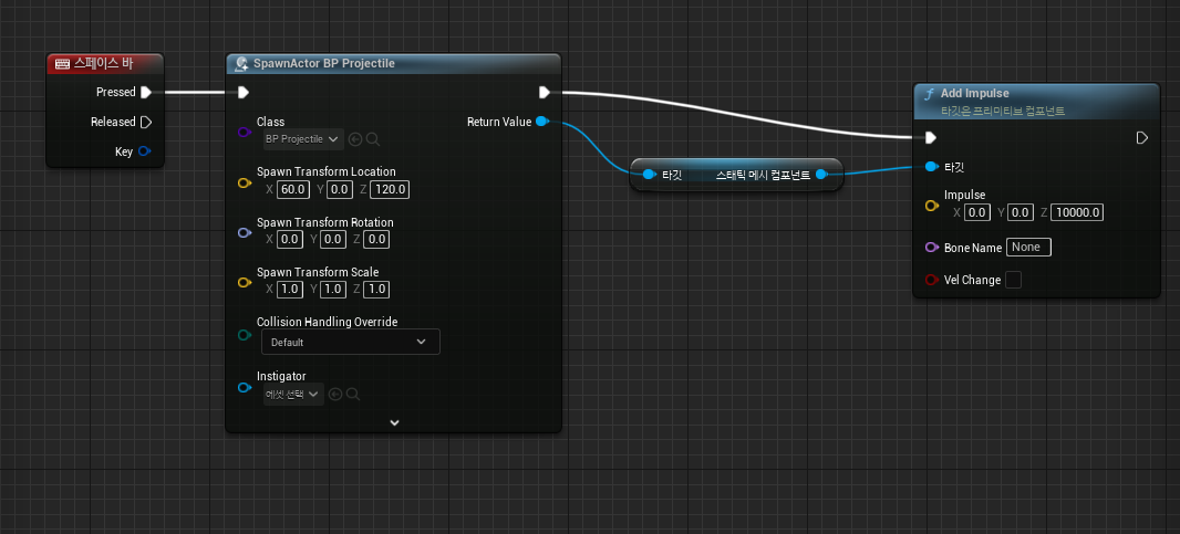 따라서 다음과 같이 연결해주면 완성입니다. 스페이스바를 누를 때 마다, BP_Projectile이 Spawn되고, Impulse가 z축으로 10000만큼 추가됩니다.