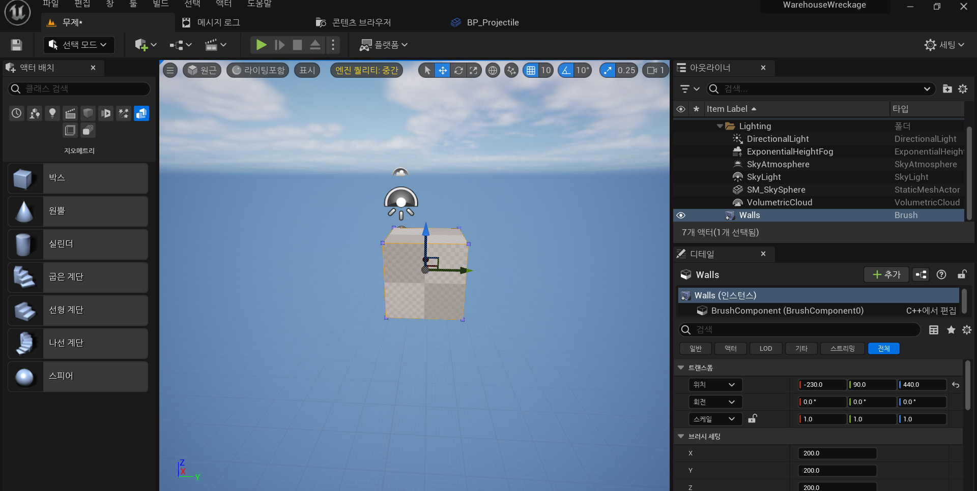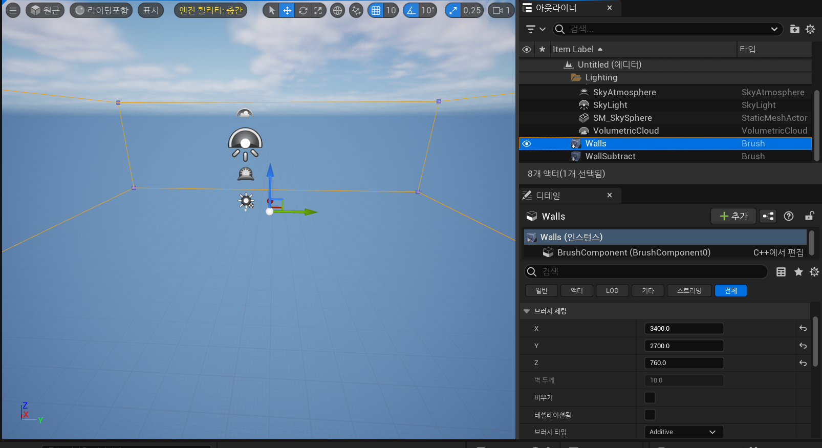 박스 브러쉬 생성후, Walls로 이름 변경