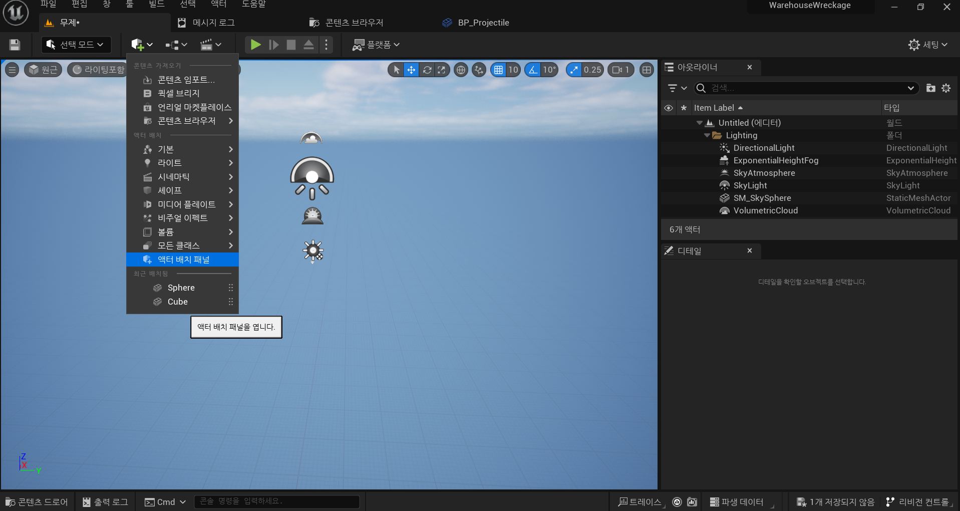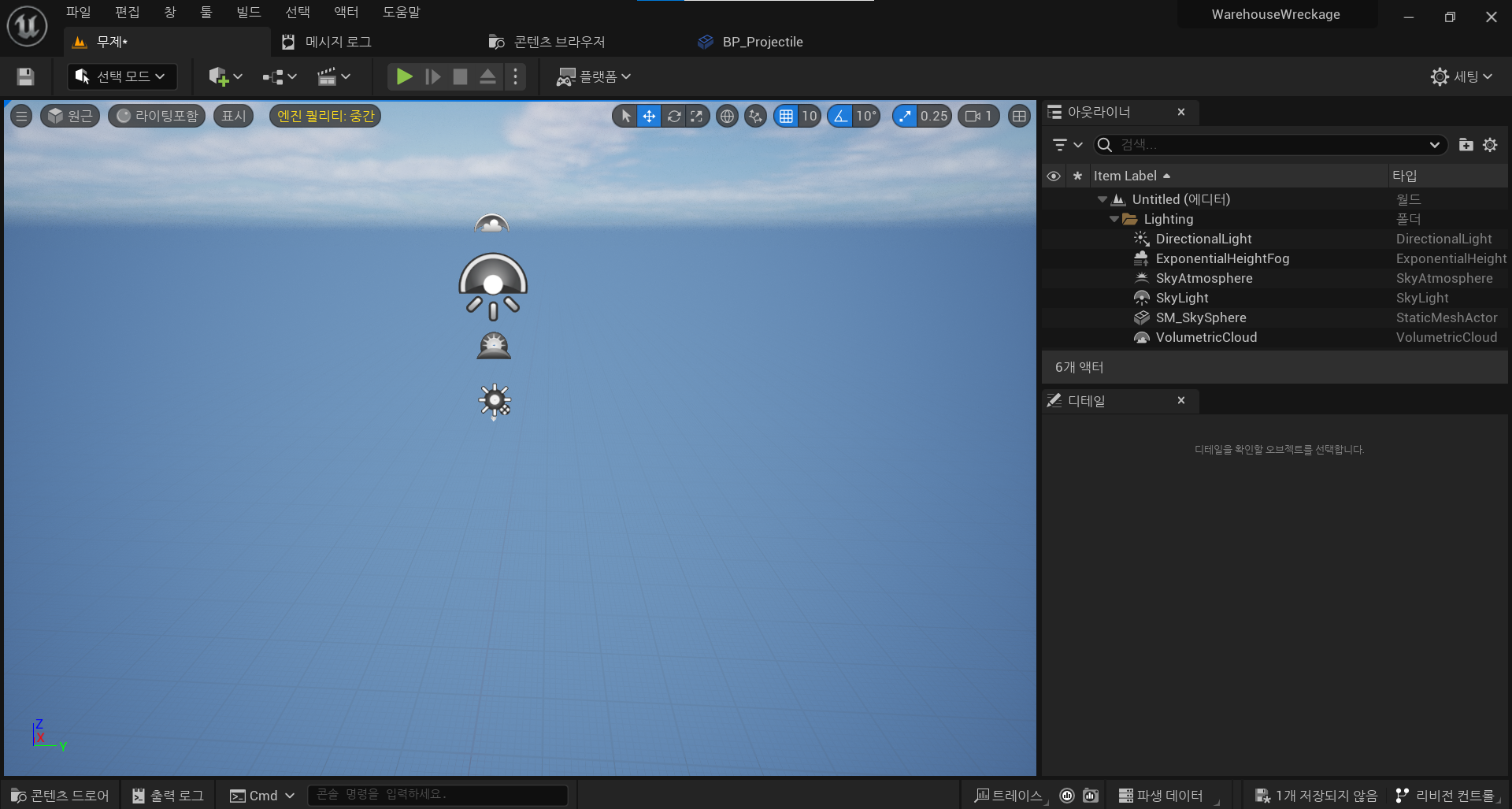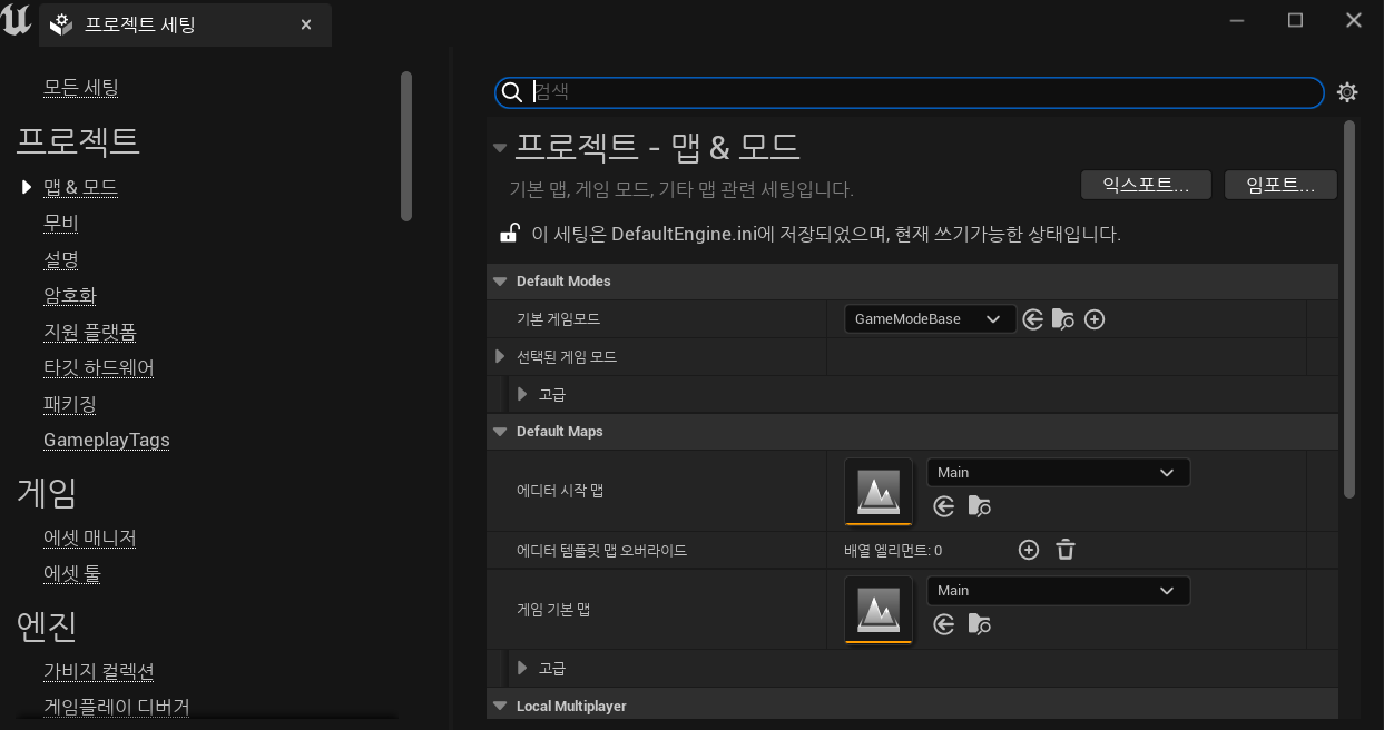 그 후, Main이라는 이름으로 레벨을 저장후, Project Setting > 맵 & 모드 의 에디터 시작 맵과 게임 기본 맵을 Main으로 변경