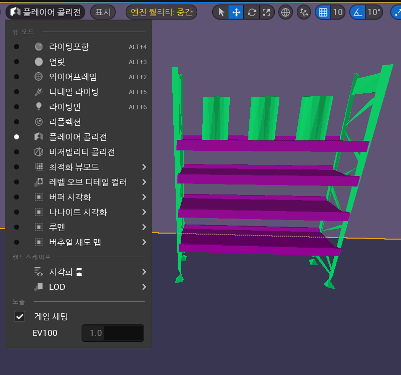 플레이어 콜리전으로 확인해보면 단순화된 Collision Mesh 를 확인할 수 있습니다. 메시를 단순화하는 이유는 수학계산에 사용하기 위함 입니다.