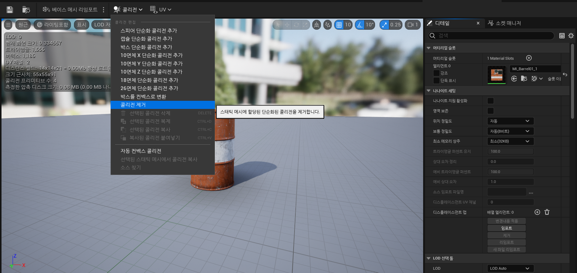 다음과 같이 메시에 적용되어있는 콜리전을 제거하거나, 단순화 콜리전을 추가할 수 있습니다.